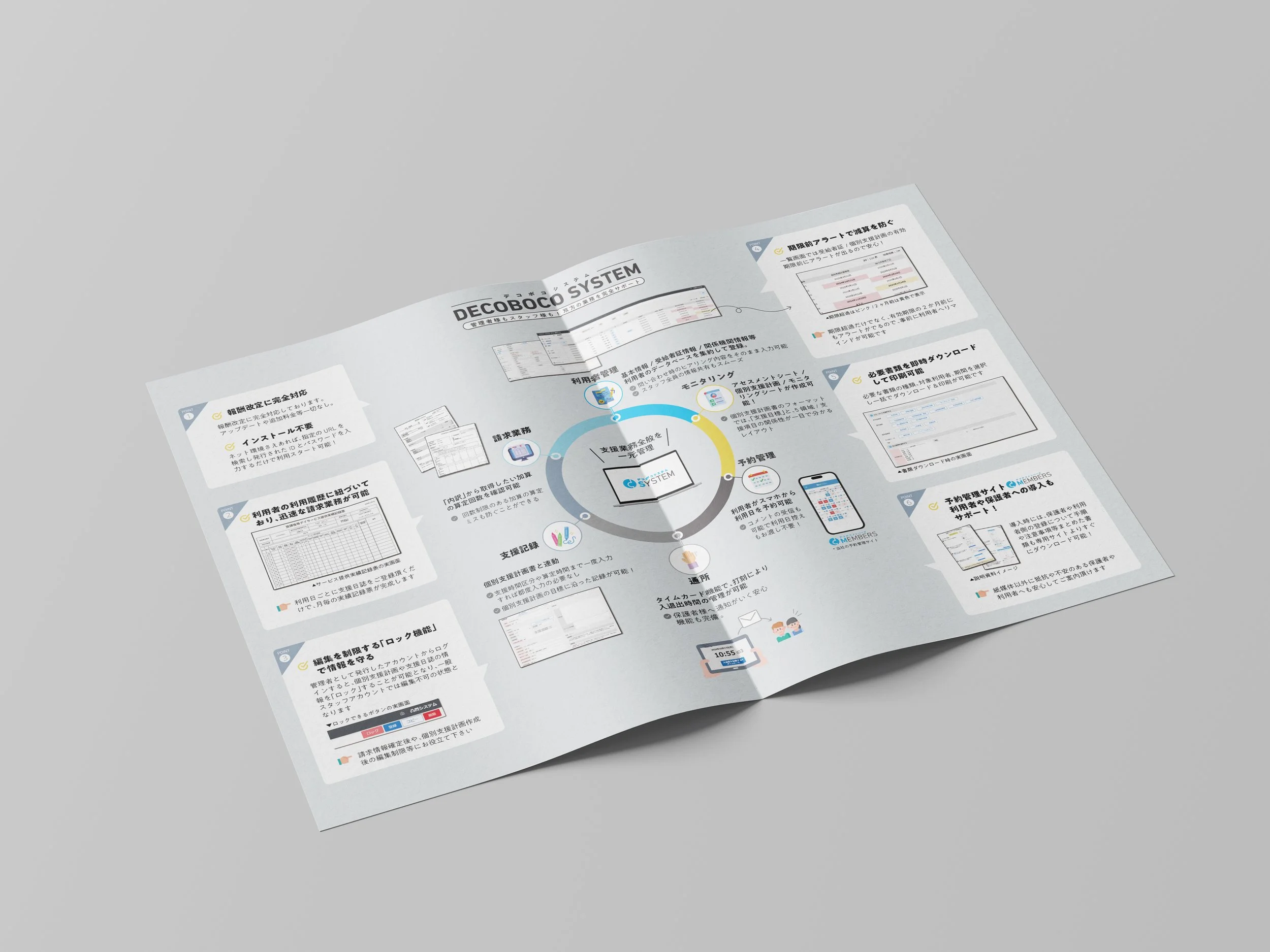 様のデコボコシステムというサービスを紹介するパンフレットをデザインさせていただきました。